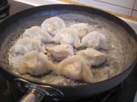接下來就倒水至餃子的一半高度後(可以從餃子淋上水,讓餃子的粉卸除,這就是麵粉水了),開火並蓋上鍋蓋,直至水分快燒乾(鍋底的水開始冒泡,且滋滋作響),就可以關小火,待至底部燒乾焦黃呈咖啡色(由於此時小火在鍋面中央,中央部位會先焦黃,而周圍仍呈白色,